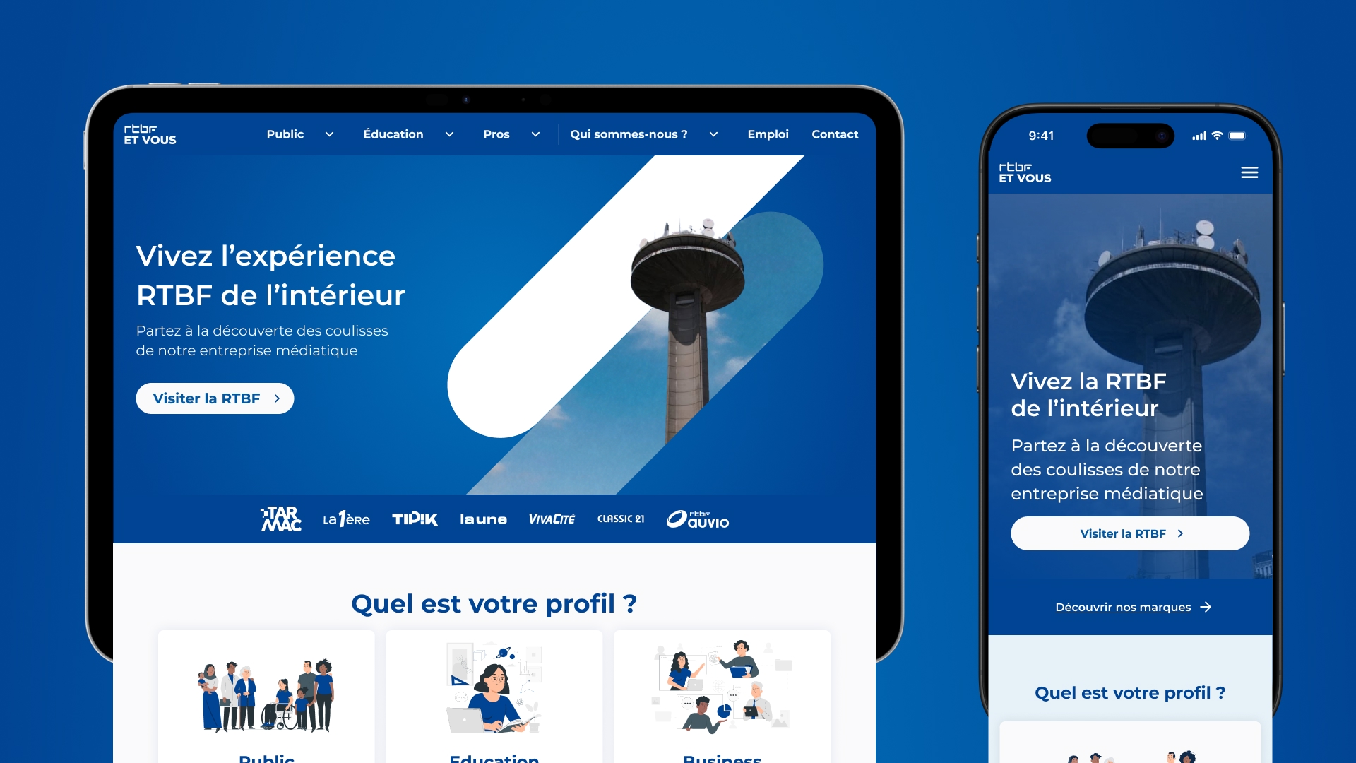 The new RTBF et vous homepage was designed to help users quickly find their way by segmenting content into three clear entry points — Public, Education, and Business — each tailored to a specific audience and its needs.